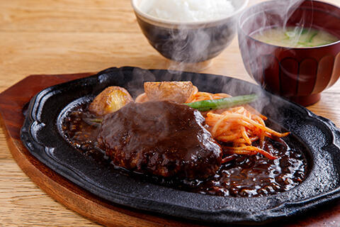 とことん「出来立て」にこだわった肉汁ジューシーなハンバーグを、ツヤツヤで美味しいごはんと一緒にお召し上がりいただけます。