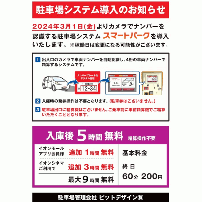 2024年3月1日(金)よりカメラでナンバーを認識する駐車場システム スマートパークを導入いたしました。