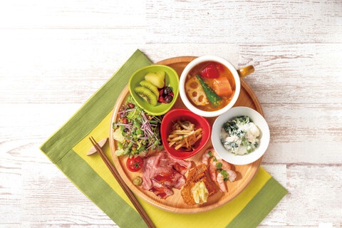 様々なジャンルのメニューを組み合わせた食事や野菜を中心とした多品種の食材を使用し、「栄養バランス」のとれた「見た目にも彩り豊かな」食事とスイーツをご提案。