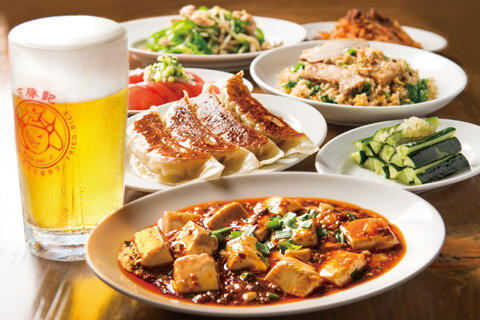 豚モチーフが踊る店内で、大餃子や焼き小籠包、つまみ、辛旨の一品からまず一杯。